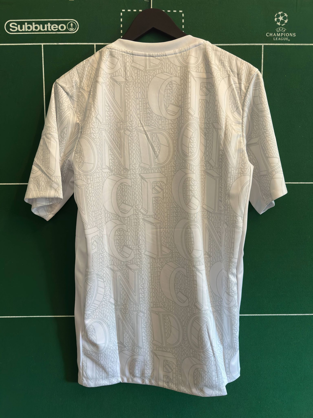 - All-over text pattern incorporating ‘CFC’ and ‘London’
